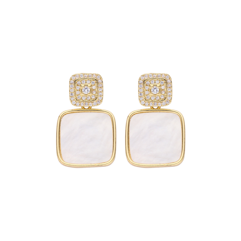 Ecru oorbellen met glanzende steen in hars en goudkleurige afwerking.